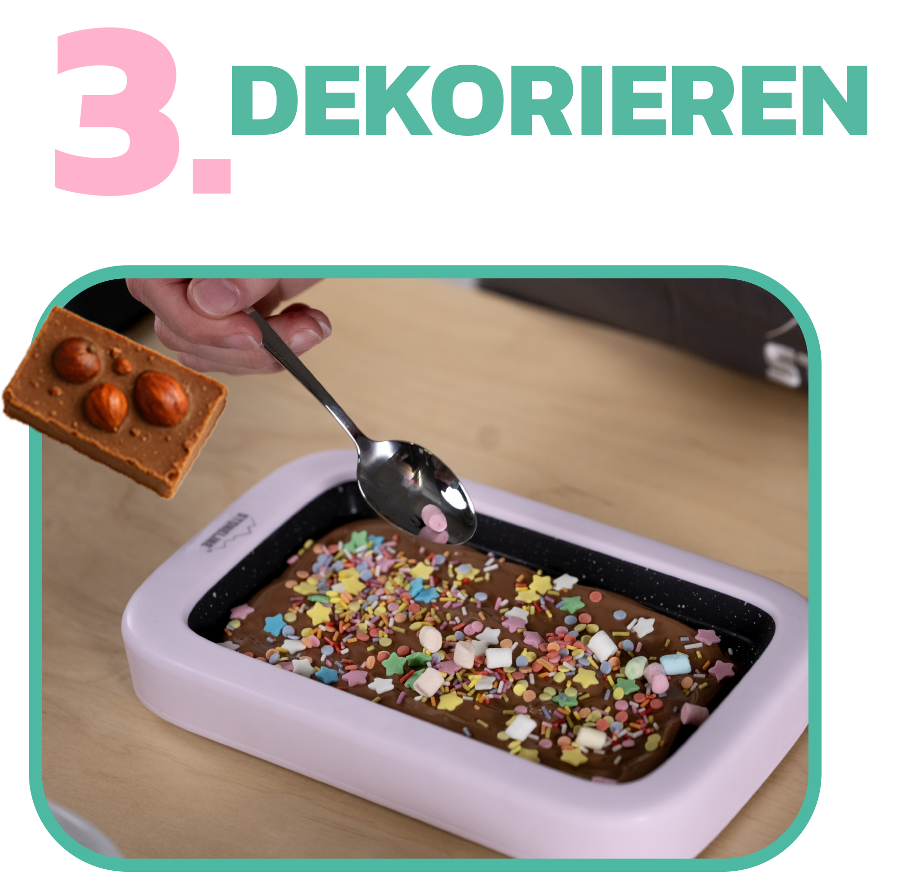 Dann das gewünschte Topping drüberstreuen, 10 Minuten durchkühlen lassen und voilà – durch Umdrehen der Platte löst du die Schokolade aus der Form und kannst leckere Bruchschokolade genießen. Yummi!