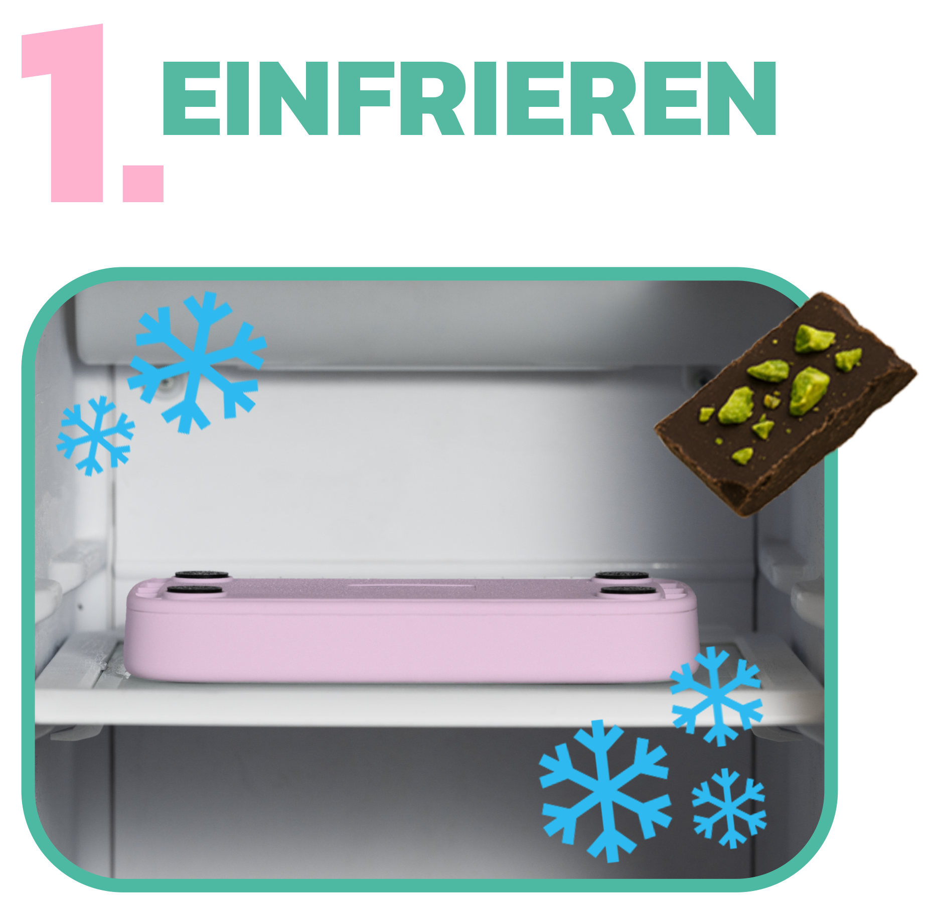 Lege die Schokoladenform mit der antihaftbeschichteten Fläche nach unten für ca.12 Stunden bei - 20 °C in den Gefrierschrank.