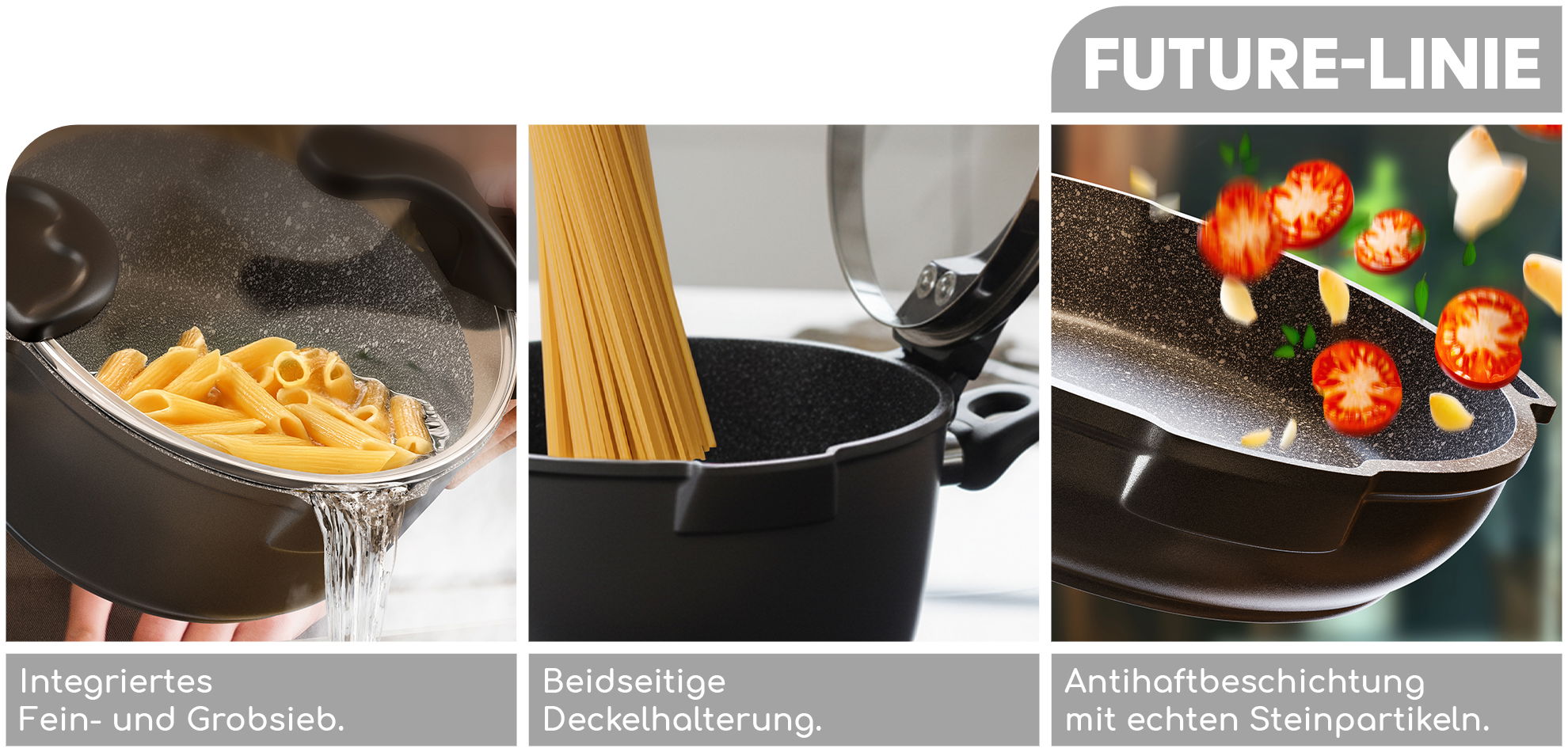 Le padelle in acciaio inox Silverstar® con rivestimento antiaderente sono adatte a tutti i tipi di piano cottura e, naturalmente, possono essere utilizzate anche sui piani a induzione. Il materiale resiste a temperature fino a 220 °C nel forno. Così si va in forno con la padella e le verdure arrostite per gratinarle. Hmmm ...